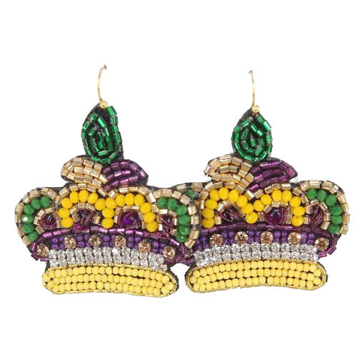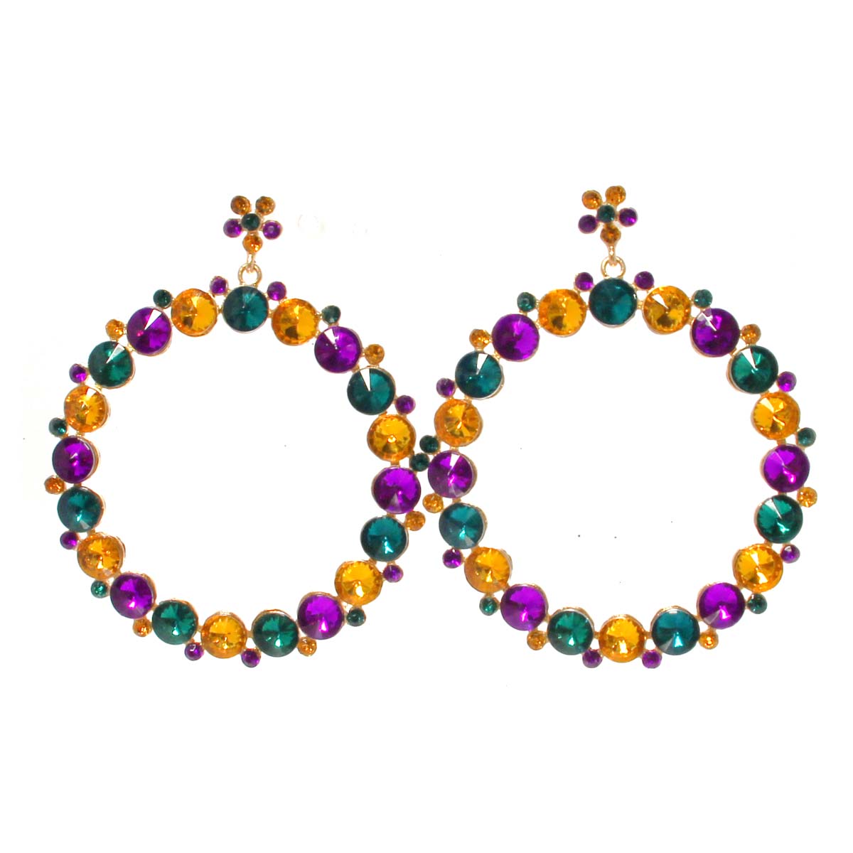 Round Purple/Green/Gold Crystal Earrings, 3", Mardi Gras